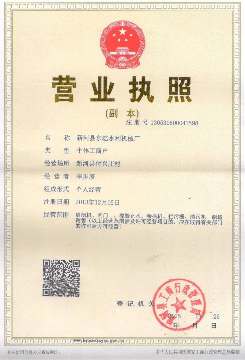 环浩水利机械厂占地面积13000平方米,现有员工196人,其中中、高级专业工程技术员工36人,是一家专门从事水工机械研发、生产、销售一体化服务规模型企业。主要产品:螺杆式启闭机、固定卷扬式启闭机、移动式启闭机、铸铁(生铁)闸门、铸钢(熟铁)闸门、钢制闸门、不锈钢闸门、玻璃钢拍门、清污机、拦污栅、橡胶止水等水利机械产品。